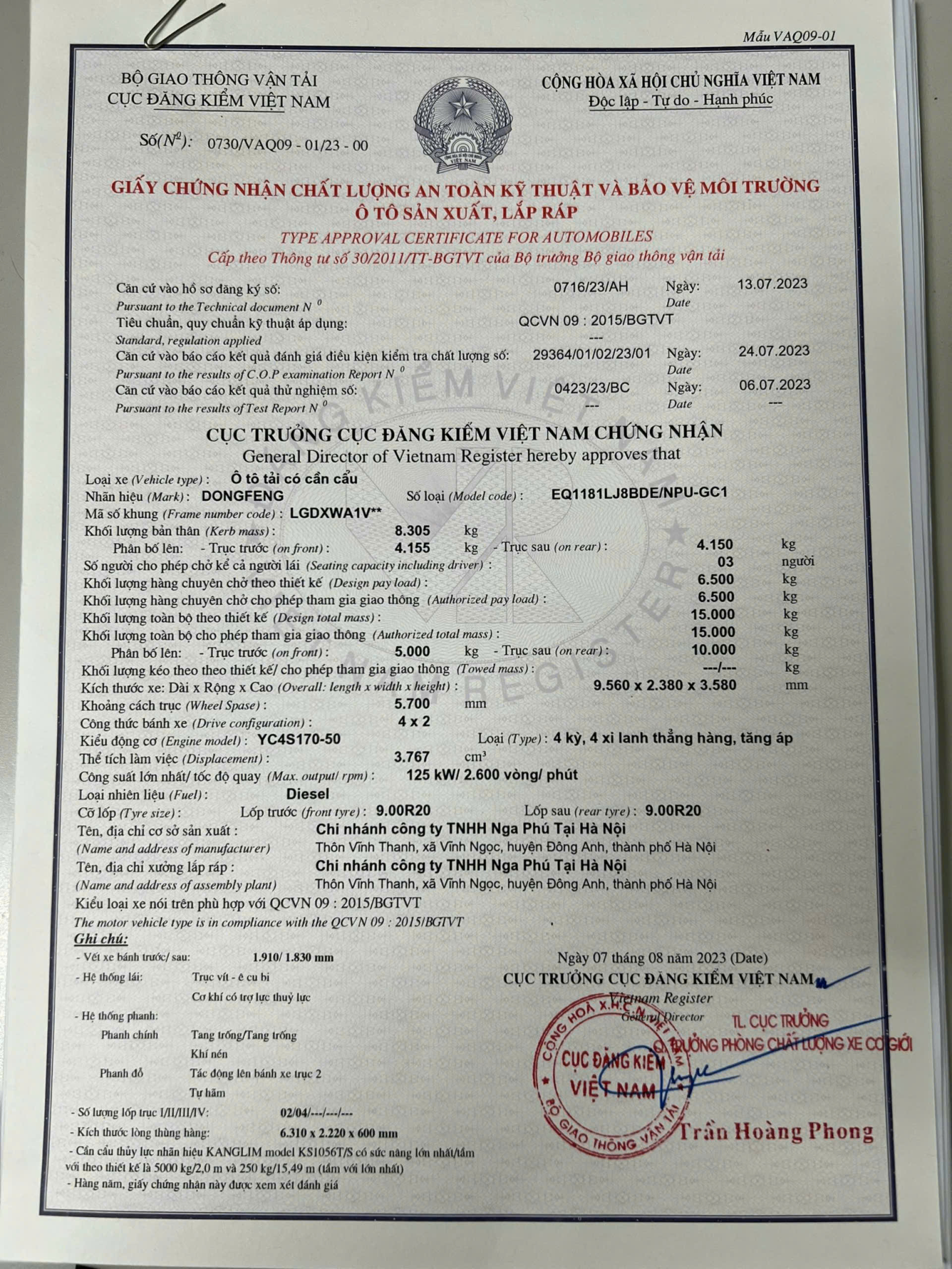 Mang tới sức mạnh tuyệt vời cho chiếc xe tải Dongfeng D8 này là khối động cơ YC4S170-50, 4 kỳ, 4 xi lanh thẳng hàng, tăng áp với dung tích xilanh lên tới 3767cc, tạo nên công suất cực đại 125 kW/ 2500 v/ph, giúp xe di chuyển mạnh mẽ kể cả khi tải hàng nặng. Động cơ hoạt động bền bỉ, tiết kiệm nhiên liệu và thân thiện với môi trường nhờ sở hữu tiêu chuẩn khí thải Euro4. Dưới đây, Hùng Anh Auto xin gửi tới quý khách, bảng thông số kỹ thuật chi tiết của mẫu xe này nhé :